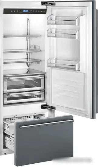 Холодильник Smeg RI76RSI встраиваемый и имеет двукомпрессорную конструкцию с системой No Frost, которая избавляет от необходимости ручной разморозки. Он выполнен в белом цвете и оснащён четырьмя полками из стекла, а также тремя дверными балконами для удобства хранения. Объём холодильной камеры составляет 327 л, а морозильной — 85 л, с функцией быстрой заморозки и генератором льда. Управление осуществляется через электронный дисплей внутри, и есть возможность настроить температуру независимо. Встроенные дополнительные функции включают режим «Отпуск», сигнал о открытой двери и блокировку от детей для безопасности. Этот холодильник отличается высокой энергоэффективностью класса A+ и уровнем шума 41 дБ. Для удобства есть автоматическая подсветка камеры и регулировка влажности в ящике для овощей. Он подходит для тех, кто ищет вместительный и современный встроенный холодильник с честными функциями и надёжной работой.