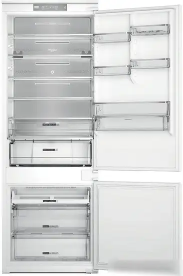 Встроенный холодильник Whirlpool WH SP70 T121 имеет двухкамерную конструкцию с нижней морозильной. Он оснащен системой No Frost, которая предотвращает образование льда и облегчает уход за устройством. В холодильной части есть пять стеклянных полок и шесть дверных балконов, а также ящик для овощей и фруктов с регулируемой влажностью. Общий полезный объем составляет 394 литра, из которых 295 литров для холодильной камеры и 99 литров — для морозильной. Управление осуществляется снаружи при помощи электронного дисплея, есть функции суперзаморозки, суперохлаждения и сигнал открытия двери. Холодильник работает тихо — уровень шума всего 32 дБ и класс шума B. Он подходит для встраивания в нишу высотой около 194 см и шириной 71–72 см. Устройство выполнено в белом цвете и имеет возможность перенавешивания дверей для удобной установки.