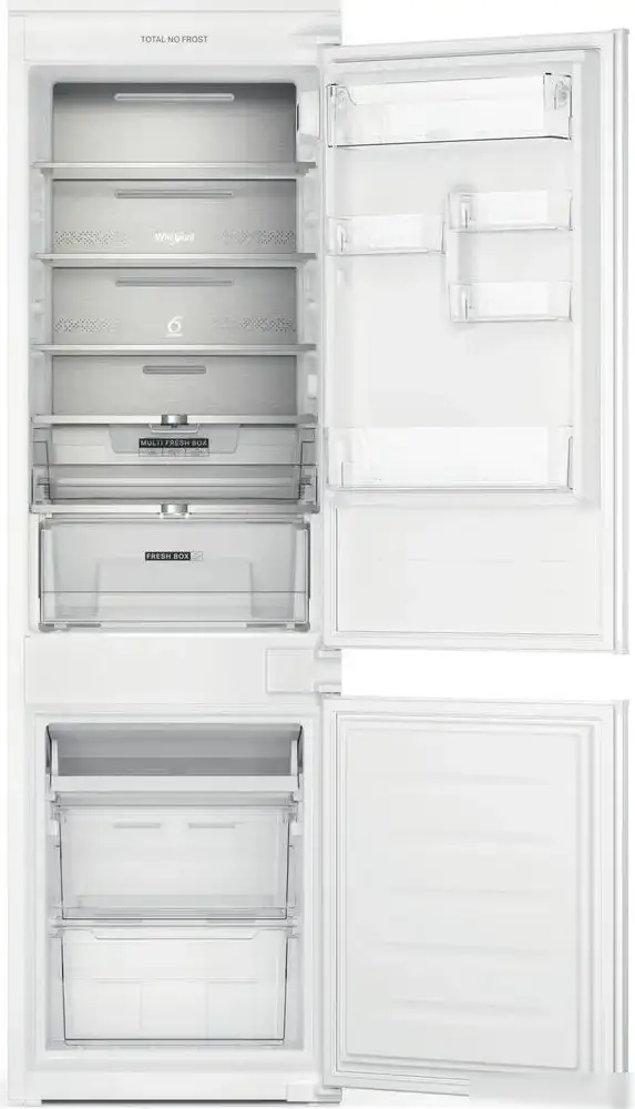 Холодильник Whirlpool WHC18 T132 — это встроенное устройство с нижней морозильной камерой, которое хорошо подходит для кухни. Оно имеет полный No Frost, что предотвращает накопление льда и облегчает уход. Объём холодильной камеры составляет 182 л, а морозильной — 68 л, всего 250 л полезного пространства хранения. В холодильнике есть 4 полки из стекла, 5 дверных балконов и ящик для овощей с регулируемой влажностью. Управление производится при помощи электронного дисплея внутри, а двери можно переносить — их легко переставлять. Модель оснащена функциями суперзаморозки и сигналом при открытой двери, что сохраняет продукты свежими и предотвращает порчу. Работает она очень тихо с уровнем шума всего 32 дБ и хорошо энергоэффективна — класс E, расходуя около 224 кВт·ч в год. Благодаря инверторной технологии устройство работает экономно и долговечно. Класс климатического режима — SN, N, ST, T, что позволяет использовать холодильник в разных условиях.