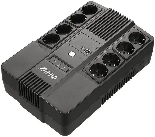 Источник бесперебойного питания Powerman Brick 850 Plus имеет 8 розеток, из которых 4 обеспечивают резервное питание. Он подключается к сети через стандартную входную розетку Schuko и способен работать в диапазоне напряжения 220 В ±10%. Этот ИБП обеспечивает выходное напряжение и частоту, близкие к синусоиде, что помогает защищать подключённую технику. Время работы при полной нагрузке составляет от 3 до 25 минут. Модель оснащена световой и звуковой индикацией, а также защитой линий связи по RJ-11 и RJ-45. Энергия берётся из встроенного свинцово-кислотного аккумулятора емкостью 7 Ач, перезаряжаемого за 8 часов. Этот ИБП легко соединяется с ПК через интерфейс USB для управления и контроля работы.