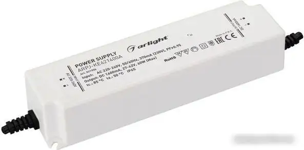 Блок питания Arlight ARPJ-KE421400A обеспечивает стабильное питание устройств с входным напряжением 220-240 В и регулируемым выходным напряжением от 27 до 42 В. Он предназначен для монтажа в защитный корпус из пластика с пыле- и влагозащитой IP65, что позволяет использовать его на улице или в влажных условиях. Блок питания имеет мощность 60 Вт, что подходит для большинства бытовых и промышленных устройств. Он подключается через проводной разъем и легко устанавливается благодаря компактным размерам — 162x43x32 мм. Устройство обеспечивает надежную работу и защищает подключенное оборудование от влажности и пыли. Стандартный корпус из пластика гарантирует долговечность и безопасность в эксплуатации. Эта модель идеально подходит для проектов, требующих надежного источника питания на улице или в сложных условиях. Такой блок легко интегрируется в существующие системы благодаря простоте подключения и универсальности. Его использование помогает обеспечить стабильное питание и защиту подключенных устройств в различных средах.