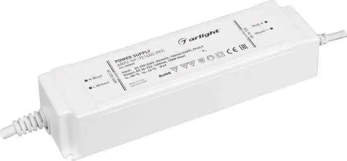 Блок питания Arlight ARPJ-SP-721400-PFC обеспечивает надежное питание для ваших устройств. Он выполнен в влагозащищённом корпусе IP67, что позволяет использовать его в помещениях с повышенной влажностью и на улице. Корпус сделан из прочного пластика, он защищает внутренние компоненты от пыли и влаги. Блок питания поддерживает входное напряжение 220–240 В и предоставляет регулируемое выходное напряжение в диапазоне 36–72 В. Он способен выдавать мощность до 100 Вт, что подходит для большинства световых и электронных систем. Размеры устройства: длина 193 мм, ширина 52 мм, высота 37 мм, что позволяет удобно разместить его в ограниченном пространстве. Благодаря высокой степени защиты IP67, он подойдет для монтажа как внутри помещений, так и снаружи. Блок питания не имеет разъема подключения, что делает его более универсальным для различных монтажных решений.