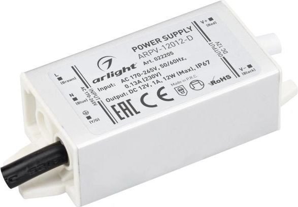 Блок питания Arlight ARPV-12012-D обеспечивает стабильное питание устройств с выходным напряжением 12 В и мощностью 12 Вт. Он оснащён защитным кожухом из пластика, что защищает от пыли и влаги благодаря степени IP67. Устройство подключают через проводной разъем, что обеспечивает надежное соединение. Блок удобно устанавливается благодаря компактным размерам: длиной 80 мм, шириной 30 мм и высотой 20 мм. Он подходит для использования в условиях, где важна защита от окружающей среды. Блок работает при входном напряжении от 170 до 265 В, что делает его универсальным. Встроенная защита помогает сохранить устройство в случае кратковременных перегрузок. Малый вес и компактные размеры позволяют легко размещать его в ограниченных пространствах. Это решение подходит для различных световых, охранных или автоматических систем. Благодаря простоте подключения и надежности, он долго сохраняет работоспособность.