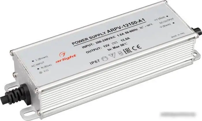 Блок питания Arlight ARPV-12150-A1 обеспечивает стабильное питание с выходным напряжением 12 В и мощностью 150 Вт. Он предназначен для использования в условиях, требующих влагозащиты, и имеет влагонепроницаемый корпус с классом IP67, что позволяет устанавливать его на улице или в влажных помещениях. Устройство подключается без разъема и работает при входном напряжении 200-240 В, что делает его универсальным для различных сетей. Размеры блока питания — 174 мм длиной, 56 мм шириной и 36 мм высотой, он легко вписывается в разные монтажные пространства. Встроенная защита помогает предотвратить повреждения при перепадах напряжения или пыли. Он надежно работает при воздействии пыли и влаги, что повышает его долговечность. Такой блок питания подходит для освещения и других устройств, требующих стабильного напряжения. Он прост в установке и использует качественные компоненты для долговременной работы.