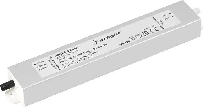 Блок питания Arlight ARPV-24030-B обеспечивает стабильное питание с выходным напряжением 24 В и мощностью 30 Вт, что подходит для различных проектов. Его влагозащищённый корпус с сертификацией IP67 защищает устройство от пыли и влаги, позволяя использовать его на открытом воздухе или во влажных условиях. Размеры блока составляют 182x29x20 мм, он компактный и легко разместится в различных монтажных местах. Активное охлаждение с помощью вентилятора не предусмотрено, что делает его надёжным и бесшумным. Блок работает при входном напряжении 200–240 В, что подходит для разных электросетей. Он оснащен разъемами подключения, которые отсутствуют, что упрощает монтаж и подключение. Поддерживая выходной ток до 1250 мА при 12 В, устройство подходит для питания светильников и небольших устройств. Минималистичный дизайн и прочный стальной корпус делают его долговечным и устойчивым к воздействию внешней среды.