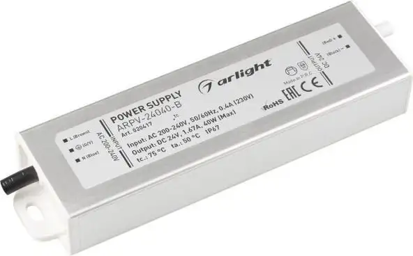 Блок питания Arlight ARPV-24040-B 020417 предназначен для стабильного питания устройств с напряжением 24В. Он подключается через провод и обеспечивает выходную мощность до 40 Вт, что подходит для различных электроустройств. Корпус выполнен из пластика и оснащен защитным кожухом, что гарантирует безопасность и долговечность работы. Он работает при входном напряжении от 200 до 240 В и отличается высокой защитой от пыли и влаги по стандарту IP67. Размеры блока составляют 148 мм в длину, 40 мм в ширину и 22 мм в высоту, что делает его компактным и удобным для монтажа. Это устройство надежно защищает подключенные устройства от перепадов напряжения и коротких замыканий. Благодаря прочной конструкции оно подходит для использования в помещении и на улице. Легко устанавливается и подключается, обеспечивает стабильное электроснабжение. Таким образом, этот блок питания — практичный выбор для безопасной работы электроустройств.