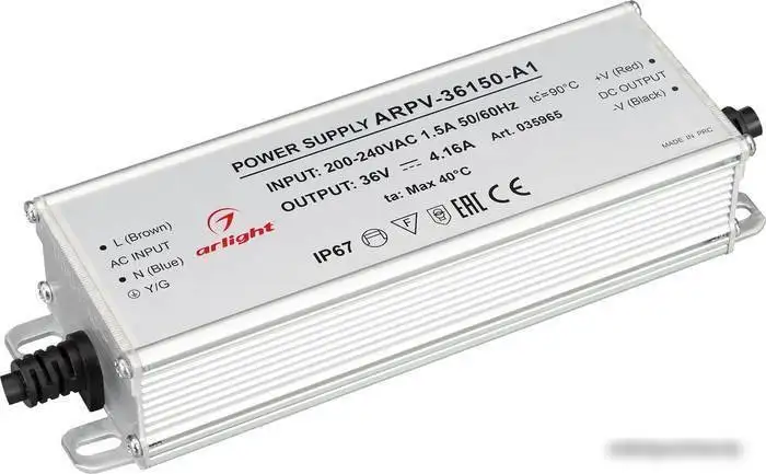 Блок питания Arlight ARPV-36150-A1 обеспечивает стабильное питание с выходным напряжением 36 В и мощностью 150 Вт. Он имеет влагозащищенный корпус IP67, что позволяет устанавливать его в места с высокой влажностью или наружу без риска повреждений. Блок не имеет разъема подключения, его можно подключить напрямую к источнику питания. Размеры устройства — 174 мм в длину, 56 мм в ширину и 36 мм в высоту, что удобно для размещения в различных проектах. Он работает на входном напряжении 200–240 В и легко интегрируется в системы освещения или другие электросети. Блок питания надежно защищен от пыли и влаги, что увеличивает срок его службы. Он подходит для использования в уличных и влажных средах благодаря степени пыле- и влагозащиты IP67. Простая установка и высокая надежность делают этот блок отличным выбором для разнообразных задач.