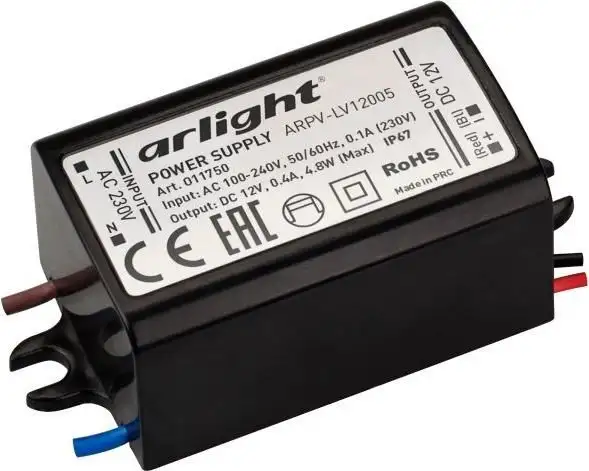 Блок питания Arlight ARPV-LV12005 обеспечивает стабильное питание устройств с выходным напряжением 12 В и мощностью 4,8 Вт. Он имеет надежный защитный кожух и пластиковый корпус, что делает его более устойчивым к пыли и влаге (степень защиты IP67). Блок легко подключается через проводной разъем и подходит для различных бытовых и промышленных применений. Благодаря компактным размерам (59x28x22 мм), его удобно установить в ограниченных пространствах. Он поддерживает входное напряжение от 100 до 240 В, что обеспечивает универсальность использования. Устройство работает надежно и стабильно, обеспечивая длительный срок службы.