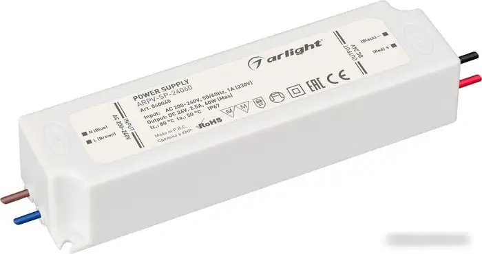 Блок питания Arlight ARPV-SP-24060 040045 предназначен для надежного питания устройств с выходным напряжением 24 В и мощностью 60 Вт. Он выполнен в пластиковом корпусе с защитным кожухом, что обеспечивает защиту от пыли и влаги в соответствии с стандартом IP67. Блок подключается через проводной разъем, что облегчает монтаж и подключение. Он работает при входном напряжении от 200 до 240 В, что делает его универсальным для различных электросетей. Благодаря компактным размерам (148x40x32 мм) занимает мало места в системе. Он стабильно обеспечивает ток до 2,5 мА, что подходит для низкотоковых устройств. Устройство устойчиво к пыли и влаге, что повышает его долговечность и надежность. Простая установка и высокая надежность делают этот блок питания хорошим выбором для различных проектов.