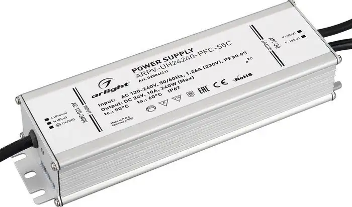 Блок питания Arlight ARPV-UH 025046(1) выполнен из прочного алюминия, который защищает его от повреждений. Он работает при входном напряжении от 120 до 240 В и выдает стабильное напряжение 24 В. Мощность устройства составляет 240 Вт, что подходит для различных осветительных систем и другого оборудования. Благодаря степени защиты IP67, блок питания устойчив к пыли и воде, его можно использовать как внутри помещений, так и на открытом воздухе. Размеры позволяют легко разместить его в ограниченном пространстве — длина 188 мм, ширина 67,5 мм и высота 38,5 мм. Он быстро и надежно обеспечивает питание подключенных устройств, сохраняя стабильность работы. Простота в установке и долговечность делают этот блок хорошим выбором для разных задач. Надежно защитит оборудование даже в сложных условиях эксплуатации.