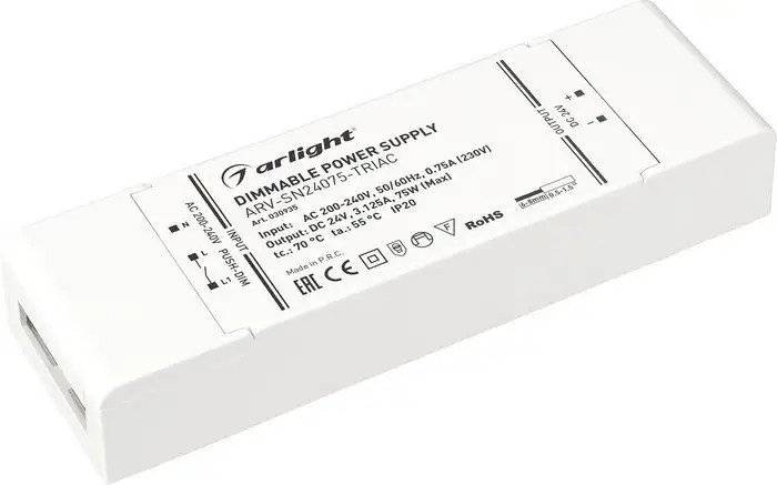 Блок питания Arlight ARV-SN 030935 предназначен для стабильного питания световых устройств. Он работает при входном напряжении 200–240 В и выдает стабильное выходное напряжение 24 В. Мощность устройства составляет 75 Вт, что подходит для большинства проектов освещения. Корпус изготовлен из прочного пластика и обладает степенью защиты IP20, что обеспечивает защиту от пыли и влаги внутри помещений. Размеры устройства: длина 179 мм, ширина 56 мм и высота 30 мм, что позволяет легко установить его в ограниченных пространствах. Блок питания надежно стабилизирует напряжение, предотвращая возможные сбои работы световых приборов. Он прост в использовании и подключении, подходит для различных световых систем. Благодаря компактности и защите, устройство подходит для домашнего и коммерческого использования. Это решение помогает обеспечить долговечную и безопасную работу освещения.
