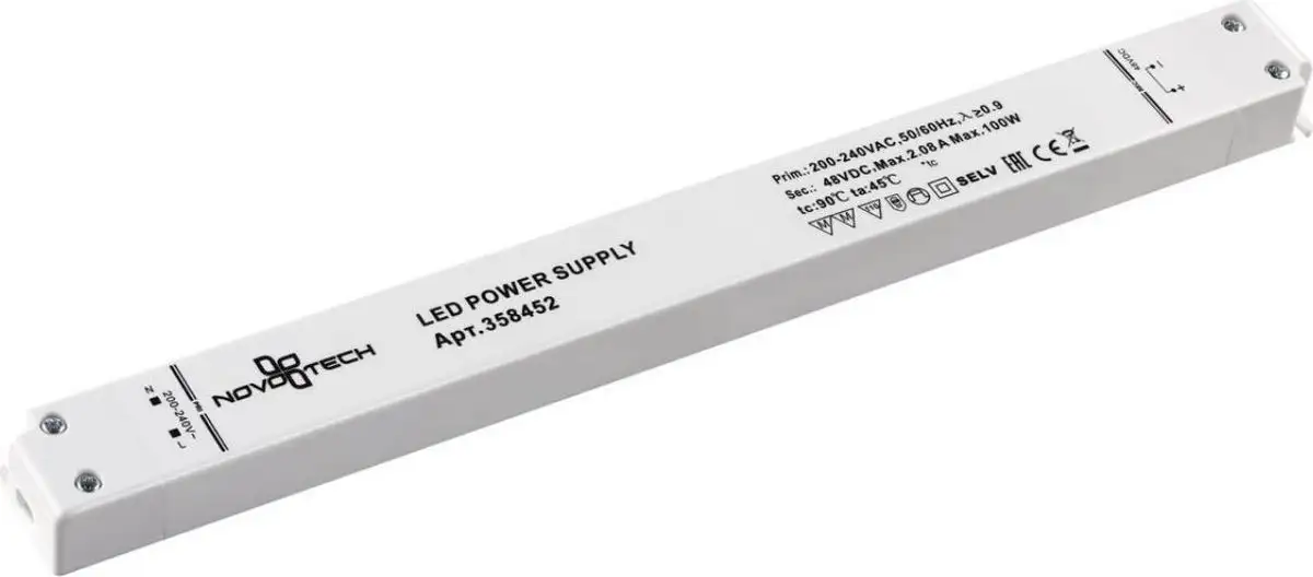 Светодиодный драйвер Novotech Drive 358452 предназначен для питания мощных светодиодов. Он имеет компактный корпус из пластика, который легко разместить в различных проектах. Драйвер обеспечивает стабилизацию напряжения 48 В и мощность до 100 Вт, что позволяет подключать яркие и мощные светильники. Он защищен от перегрева благодаря активному охлаждению вентилятором, что увеличивает срок службы устройства. Прост в подключении — использует клеммы для удобства монтажа. Степень защиты IP20 обеспечивает надежную работу внутри помещения. Классический белый цвет корпуса хорошо сочетается с любым интерьером. Устройство работает при входном напряжении 200-240 В, что позволяет использовать его в разных странах. Размеры 320x30x18 мм позволяют без труда установить драйвер в ограниченных пространствах. Благодаря этим характеристикам, новотеч драйвер обеспечивает стабильное и надежное питание вашего освещения.