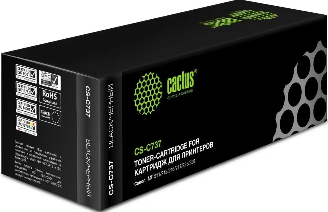 Картридж CACTUS CS-C737 подходит для печати в домашних и офисных условиях и совместим с несколькими моделями принтеров Canon, такими как i-SENSYS MF211 и MF216n. Он использует лазерную технологию, что обеспечивает быстрое и качественное воспроизведение документов. Этот картридж не является оригинальным, но обеспечивает чёрный цвет печати и способен напечатать до 2 400 страниц, что позволяет снизить расходы на замену. Удобно использовать благодаря совместимости с популярными моделями принтеров Canon. Картридж легко устанавливается и обеспечивает стабильное качество печати. Не требует сложных настроек и подходит для активной ежедневной работы. Высокая производительность помогает увеличить эффективность работы в офисе. Надёжность и простота замены делают его отличным выбором для частых задач печати.