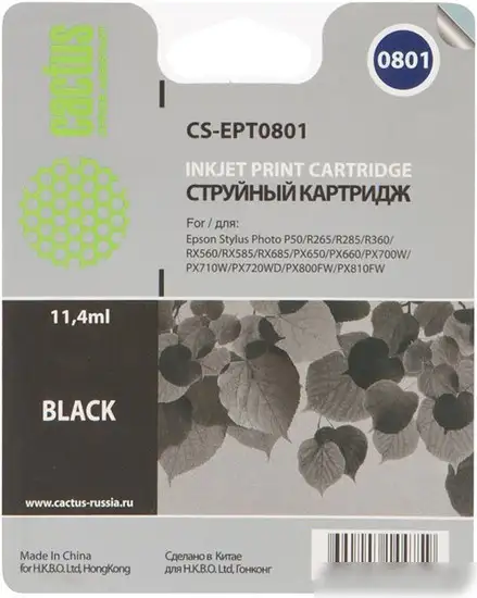 Картридж CACTUS CS-EPT0801 подходит для различных моделей принтеров Epson Stylus Photo и Epson Stylus Fax. Он работает на струйной технологии и не является оригинальным товаром, что делает его более доступным по цене. Объем чернил составляет 11.4 мл, что позволяет печатать больше страниц без замены. Картридж обеспечивает яркие и чёткие черные изображения и текст. Его легко устанавливать и использовать в совместимых моделях принтеров Epson. Благодаря высокому качеству печати, он подходит для домашних и офисных задач. Картридж помогает снизить затраты на печать без потери качества. Он совместим с распространенными моделями, такими как PX650, PX700W и RX685. Удобен для тех, кто ищет надежное и экономное решение для черной печати.