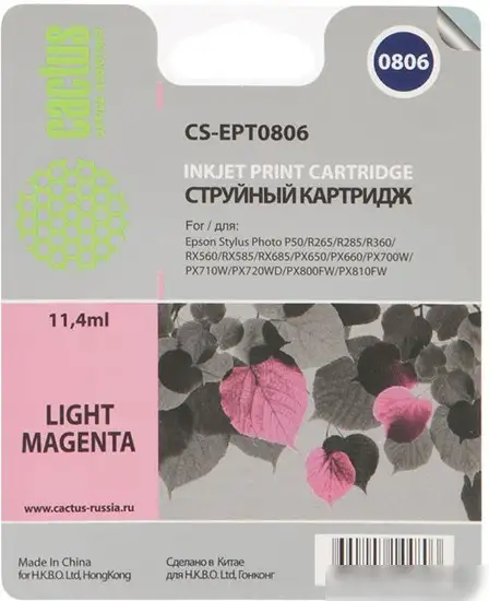 Картридж CACTUS CS-EPT0806 подходит для широкого ряда принтеров Epson Stylus Photo и моделей RX, R. Он использует струйную технологию печати и подходит для тех, кто ищет недорогую оригинальную опцию. Картридж не является оригиналом, но обеспечивает качественную цветную печать. Объем чернил составляет 11,4 мл, что позволяет напечатать много страниц без частой замены. Он используется для печати ярких фотографий и ярких изображений. Совместимость с различными моделями Epson позволяет выбрать этот картридж для нескольких устройств. Установка не вызывает сложностей, он быстро вставляется в принтер. Этот картридж помогает обеспечить стабильную работу устройства и яркие цвета.