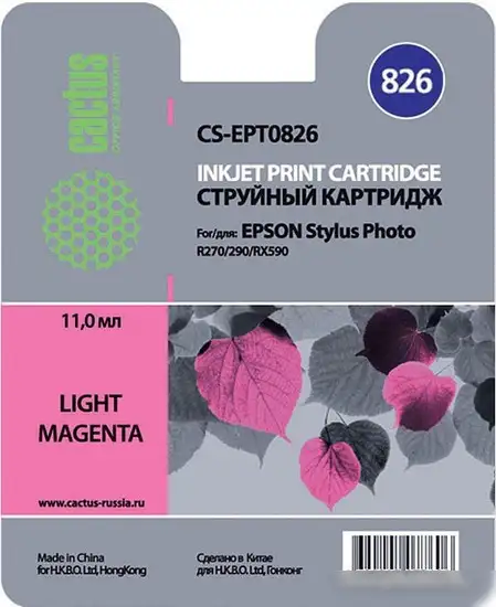 Картридж CACTUS CS-EPT0826 подходит для печати ярких фотографий и изображений. Он выполнен на основе водорастворимых чернил, что позволяет получать насыщенные и качественные цвета. Объем картриджа составляет 11 мл, чего достаточно для печати большого количества фотографий или документов. Этот картридж совместим со многими моделями принтеров Epson Stylus серии, что делает его универсальным решением. Он не является оригиналом, но полностью совместим с оригинальным картриджем C13T08264A10, обеспечивая хорошее качество печати. Удобная установка и надежность позволяют легко заменять картридж без потери времени. Использование этого картриджа помогает сэкономить деньги без потери качества изображений.