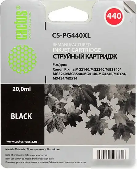 Картридж CACTUS CS-PG440XL подходит для многих моделей принтеров Canon PIXMA, таких как MG2140, MG2240, MG3140 и другие. Он использует струйную технологию печати, что обеспечивает качественные изображения и тексты. Этот картридж не является оригинальным, но полностью совместим с оригинальными моделями, при этом его ресурс составляет около 600 страниц. Черный цвет позволяет выполнять обычные и профессиональные задачи по печати. Благодаря большому ресурсу, вам реже придется менять картридж, что экономит ваше время и деньги. Он отлично подходит для домашних и небольших офисных задач. Картридж легко устанавливается в принтер и обеспечивает стабильную работу. Надежность и качество печати обеспечивают хорошим результатом каждую печать.