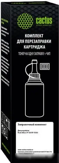 Тонер CACTUS CS-RK-SP150HE с чипом обеспечивает качественную печать в черном цвете. Он работает на лазерной технологии, что позволяет получать яркие и четкие изображения. Тонер подходит для принтеров Ricoh SP 150 и Ricoh SP 150SU, обеспечивая точную совместимость и удобство использования. Вес упаковки — 80 граммов, что упрощает замену и хранение. Тонер содержит 80 г порошка, достаточного для многих страниц. В комплекте нет картриджей, только тонер. Этот продукт не является оригинальным, но обеспечивает стабильное качество печати. Благодаря наличию чипа, он легко интегрируется и работает без ошибок. Его использование помогает снизить затраты, сохраняя хорошее качество печати.