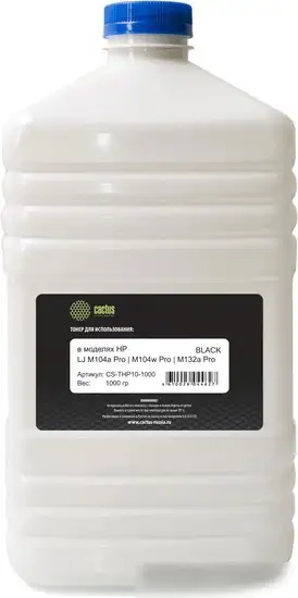 Тонер CACTUS CS-THP10-1000 подходит для лазерных принтеров HP LJ M104a, M104w, M132a, M132fn, M132fw и M132nw. Он предназначен для черной печати и обеспечивает качество изображений. Объем картриджа составляет 1000 мл, что позволяет делать много печатных страниц без частого пополнения. Тонер не является оригинальным продуктом, что делает его доступнее по цене. Он помогает достигать четкого и яркого черного текста и графики. Тонер работает с популярными моделями принтеров, легко устанавливается и использует современные технологии. Он подходит для дома и офиса, где требуется надежная и экономичная печать. Высокое качество продукции обеспечивает стабильную печать без засорения и пятен.