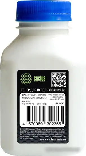 Тонер CACTUS CS-THP4-75 предназначен для лазерной печати и совместим с моделями принтеров HP LJ P1005, P1006, P1100 и P1102. Он обеспечивает яркие и четкие черно-белые отпечатки благодаря высокой концентрации чернил. Тонер не является оригинальным, что помогает снизить стоимость печати, сохраняя качество. Вес картриджа составляет 75 г, что достаточно для большого количества страниц. Установка тонера проста и быстро выполняется без специальных навыков. Он подходит для офисов и домашних пользователей, которым важна надежность и качество печати. Тонер способствует стабильному качеству изображений и текстов на протяжении всего ресурса. Благодаря совместимости с популярными моделями принтеров, он подходит для постоянного использования. Это хороший выбор для тех, кто ищет недорогий и удобный в использовании расходный материал.