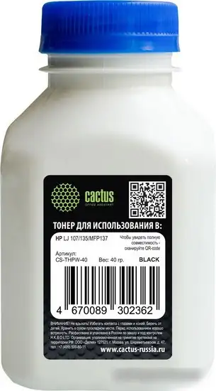 Тонер CACTUS CS-THPW-40 предназначен для чернильных принтеров и МФУ, совместимых с серией HP Laser. Он поставляется в упаковке весом 40 г и является оригинальным продуктом. Тонер обеспечивает качественную печать четких и насыщенных изображений. Он легко устанавливается и совместим с моделями HP Laser 408dn, 432fdn, 107a, 107r, 107w, 135a, 135r, 135w, а также с принтерами серии HP LaserJet MFP и Neverstop. Благодаря высокому качеству, тонер способствует долговечной печати без меловых и размытых изображений. Он предназначен для быстрого и удобного использования в домашнем или офисном пространстве. Устройство обеспечивает стабильную работу принтера и хорошее качество печати на различных типах бумаги. Тонер также легко заменяется, что ускоряет процесс печати и снижает простоечное время.