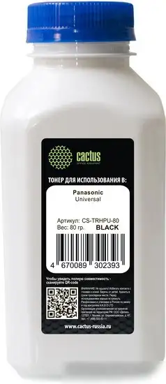 Тонер CACTUS CS-TRHPU-80 предназначен для лазерных принтеров. Он обеспечивает яркую и четкую печать черных изображений и текста. Тонер является совместимым с принтерами Panasonic Universal, что делает его универсальным выбором. Вес упаковки составляет 80 г, что позволяет получить много страниц при использовании. Этот тонер не является оригинальным, что может помочь снизить затраты. Он легко устанавливается и обеспечивает стабильное качество печати. Благодаря хорошему качеству закладки, он подходит для офисных и домашних задач. Использование этого тонера помогает уменьшить расходы без потери качества.