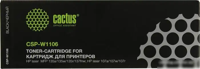 Картридж CACTUS CSP-W1106 — это совместимый аналог оригинального HP 106A W1106A, предназначенный для лазерных принтеров Laser 107, Laser 135 и Laser 137. Он обеспечивает чёткую и яркую печать благодаря лазерной технологии. Картридж не включает комплект и является неоригинальным продуктом, что помогает снизить расходы. Его ресурс составляет до 1000 страниц, что удобно для регулярной работы. Используйте этот картридж для получения качественной печати без лишних затрат. Он легко устанавливается и подходит для домашнего и офисного использования. Надёжность и совместимость обеспечивают гладкую работу принтера. Оригинальные картриджи заменяются этим аналогом без потери качества. Это хороший выбор для тех, кто ищет баланс между ценой и качеством.