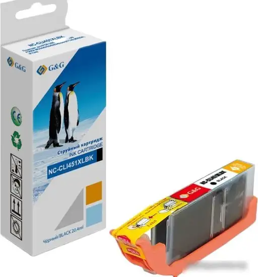Этот картридж G&G NC-CLI451XLBK обеспечивает качественную печать черных текстов и изображений. Он является аналогом оригинального Canon CLI-451BK XL, что помогает сэкономить без потери качества. Картридж не является оригиналом, но использует водорастворимые чернила, безопасные для окружающей среды. Он совместим с несколькими моделями принтеров Canon, такими как PIXMA iP7240, MG5440 и MG6340, что делает его универсальным выбором. Благодаря большому объему, он позволяет печатать больше страниц без частой замены. Прост в установке и использовании, отлично подходит для домашнего и офисного использования.