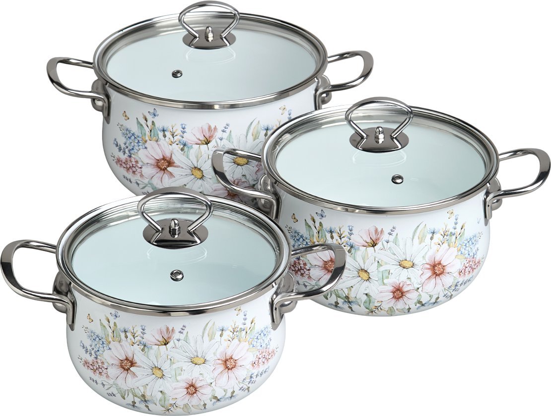 Этот набор кастрюль Agness 934-714 состоит из трех емкостей объемом 2,0, 2,8 и 3,6 литра, выполненных из эмалированной стали и украшенных цветными принтами. Каждая кастрюля имеет диаметр около 22 см и высоту 13 см, что подходит для приготовления разного количества пищи. В комплект входит три стеклянные крышки с отверстиями для выпуска пара, что позволяет контролировать процесс готовки и сохранять вкус блюд. Ручки кастрюль сделаны из прочной стали и служат долго, а их съемные элементы не предусмотрены. Эту посуду можно использовать на газовых, электрических и индукционных плитах, а также мыть в посудомоечной машине. Толщина дна в 1,2 мм обеспечивает равномерное распределение тепла. Отсутствие внутреннего покрытия упрощает уход за кастрюлями. Благодаря такому набору вы легко приготовите различные блюда и удобно их храните.