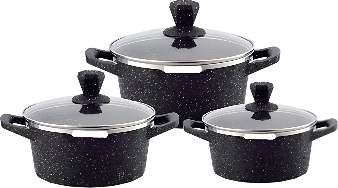 Этот набор кастрюль JIO J3032 состоит из трёх прочных кастрюль из лёгкого алюминия. Каждая кастрюля оснащена прозрачной стеклянной крышкой, которая позволяет следить за приготовлением без открытия. Внутреннее антипригарное покрытие упрощает процесс готовки и очищения посуды. Комплект подходит для всех видов конфорок — газовых и электрических. Кастрюли можно безопасно мыть в посудомоечной машине. Каждый сосуд имеет удобную бакелитовую ручку, которая не нагревается и обеспечивает хороший захват. Стильный чёрный цвет придаёт набору современный вид. Лёгкое и практичное, это устройство помогает быстро и удобно готовить любимые блюда.