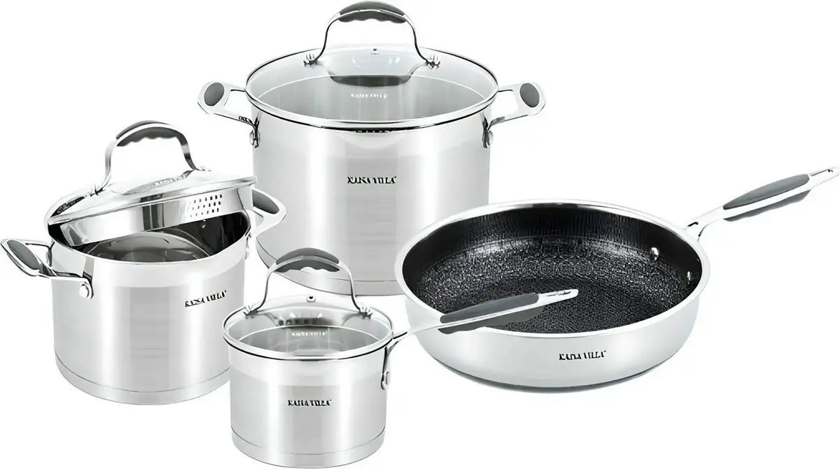 | Состав набора | кастрюли 3.9 л, 6.1 л, ковш 2.1 л, сковорода 26 см |