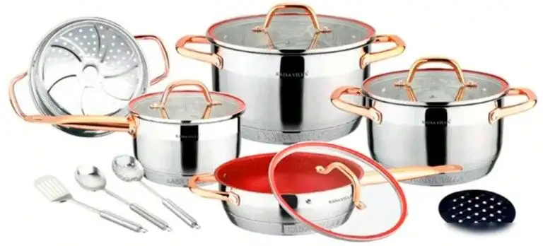 | Состав набора | 2 кастрюли с крышкой, ковш с крышкой, сковорода с крышкой, вставка-пароварка, набор кухонных аксессуаров из 4 предметов |