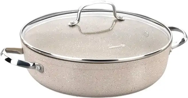Кастрюля Korkmaz Granita A1264 выполнена из легкого алюминия и имеет объем 4 литра, что идеально подходит для приготовления разнообразных блюд. Ее диаметр составляет 28 см, а высота — 7,5 см, благодаря чему она удобно используется на разных конфорках — газовых, электрических и индукционных. Внутреннее покрытие из фторопласта защищает пищу от пригорания и облегчает уборку после готовки. В комплект входит стеклянная крышка с отверстием для выпуска пара, что помогает контролировать процесс варки и предотвращает выкипание. Кастрюля подходит для мытья в посудомоечной машине, что делает уход за ней простым и быстрым. Ее бежевый цвет и компактные размеры делают ее стильной и удобной в использовании. Благодаря хорошей теплопроводности алюминия, она быстро нагревается и равномерно распределяет тепло. Крышка позволяет регулировать интенсивность тепла и контролировать пар с помощью отверстия в вентиляции. Эта кастрюля подходит для ежедневных задач на кухне и проста в использовании.