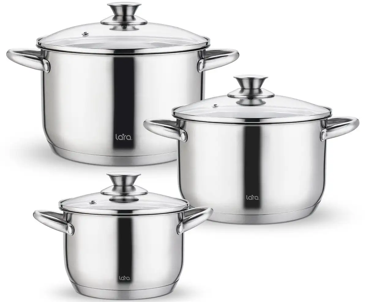 Этот набор кастрюль Lara Афина LR02-128 выполнен из нержавеющей стали, что обеспечивает долговечность и равномерное нагревание. Он включает три кастрюли с крышками объемом 2,1, 3,9 и 5,1 литров, подходящие для приготовления различных блюд. Благодаря стеклянным крышкам с отверстием для пара, вы легко контролируете процесс готовки и выпускаете пар. Кастрюли совместимы с газовыми, электрическими, стеклокерамическими и индукционными плитами для удобства использования. Стальные ручки надежно фиксированы и прочные, что повышает безопасность при использовании. Можно мыть их в посудомоечной машине для простоты ухода. Внутреннее покрытие отсутствует, что помогает сохранить вкус и натуральность продуктов. Однако эти кастрюли не пригодны для духовок и микроволновых печей. Общий дизайн из нержавеющей стали придает кухне современный вид и легко сочетается с другими приборами.
