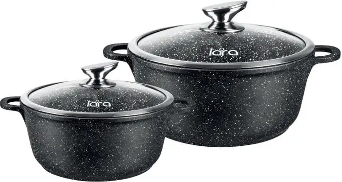 Набор кастрюль Lara Rio LR02-111 состоит из двух прочных кастрюль из алюминия с внутренним минеральным покрытием, которое облегчает очистку и защищает посуду от пригорания. В комплект входит стеклянная крышка, позволяющая контролировать процесс готовки без открытия, а алюминиевые ручки обеспечивают удобство и безопасность при использовании. Эти кастрюли подходят для работы на газовых, электросков, стеклокерамических и индукционных плитах, что делает их универсальными для любой кухни. Благодаря надежному материалу и внутреннему покрытию, посуда равномерно распределяет тепло и долго сохраняет тепло внутри. Современный черный цвет придает набору стильный внешний вид. Внутреннее покрытие минеральным слоем повышает износостойкость и позволяет готовить без дополнительных жиров. Кастрюли не оснащены съемными ручками, что способствует компактному хранению. Этот набор удобен для повседневного использования и подходит для тех, кто ценит качество и многофункциональность. Используйте его для приготовления различных блюд легко и с комфортом.