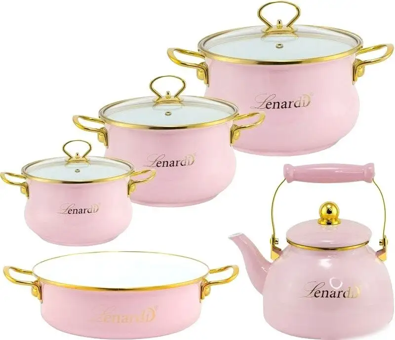 Этот набор кастрюль Lenardi Miguel включает 4 емкости из эмалированной стали различного размера. Каждая кастрюля имеет диаметр 26 см и объем 6,5 литров, что подходит для приготовления больших порций. В комплект входит стеклянная крышка с отверстием для выпуска пара, которая позволяет контролировать процесс готовки. Ручки из цинкового сплава надежно крепятся и не нагреваются во время работы. Такие кастрюли легко использовать на газовых, электросетевых и индукционных плитах. Их можно мыть в посудомоечной машине для удобства ухода. Не предназначены для духовки или микроволновки. Основная поверхность без внутреннего покрытия, поэтому их легко чистить и ухаживать. Стильный золотисто-розовый цвет делает набор красивым аксессуаром на кухне.