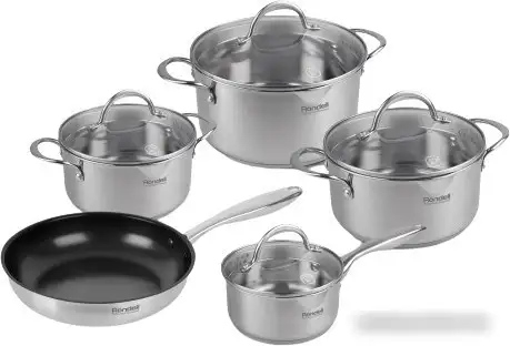 Набор кастрюль Rondell Erbe RDS-1290 состоит из четырёх кастрюль разного размера и одной сковороды, выполненных из нержавеющей стали толщиной 5 мм. В комплект входят крышки из стекла с отверстием для выпуска пара и мерной шкалой. Каждая кастрюля и сковорода рассчитаны на разные объёмы и подходят для приготовления различных блюд. Благодаря совместимости с газовыми, электрическими, стеклокерамическими и индукционными плитами, их можно использовать на любой конфорке. Кастрюли легко моются в посудомоечной машине и не портятся при этом. Отсутствие внутреннего покрытия сохраняет безопасность при готовке и чистке. Стальная ручка обеспечивает прочный и безопасный захват, а стеклянные крышки позволяют контролировать процесс приготовления. Этот набор отлично подходит для домашнего использования, сочетая качество и удобство.