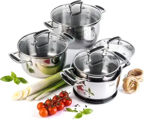 Этот набор кастрюль Taller Льюинс TR-11071 выполнен из прочной нержавеющей стали и идеально подходит для приготовления различных блюд. В комплект входят четыре кастрюли объемом от 1,5 до 5,4 литров, каждая с крышкой из стекла, что позволяет легко контролировать процесс готовки. Толщина дна составляет 5,7 мм, что обеспечивает равномерное распределение тепла и устойчивость при использовании. Кастрюли совместимы с газовыми, электрическими, стеклокерамическими и индукционными плитами. Внутреннее покрытие отсутствует, поэтому их легко мыть в посудомоечной машине. Стальные ручки с изоляцией обеспечивают безопасность и комфорт при использовании. В набор входит также бакелитовая подставка для удобства хранения. Кастрюли не пригодны для духовки и микроволновых печей, что важно учитывать при использовании. Этот набор отлично подойдет для домашней кухни благодаря простоте использования и надежности.