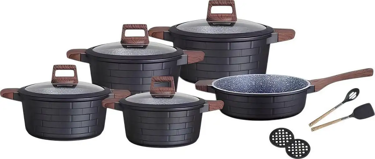 | Состав набора | кастрюля (4 шт.), крышка (4 шт.), сковорода, подставка под горячее (2 шт.), шумовка, лопатка |
