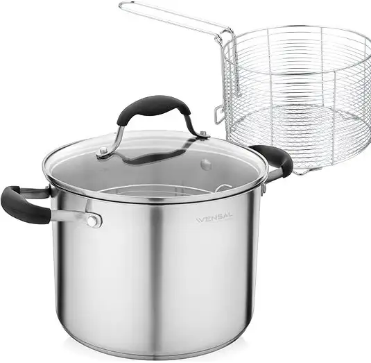 Эта кастрюля Vensal Belle Selection выполнена из нержавеющей стали, которая легко выдерживает нагрев и долго сохраняет внешний вид. Она имеет объем 6,2 литра и диаметр 22 см, что подходит для приготовления больших порций. В комплект входит стеклянная крышка с отверстием для выпуска пара, что помогает контролировать процесс варки. Кастрюля совместима с газовыми, электрическими, стеклокерамическими и индукционными плитами, что обеспечивает универсальность использования. Её ручки сделаны из стальной с изоляцией, чтобы избежать ожогов при перемещении. Устройство можно мыть в посудомоечной машине для удобства ухода. Обратите внимание, что кастрюля не пригодна для духовок и микроволновых печей. Внутреннего покрытия у кастрюли нет, поэтому потребуется использовать соответствующие средства для ухода. Эта кастрюля отлично подходит для ежедневных кухонных задач благодаря прочности и универсальности.