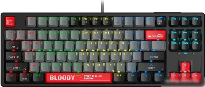 Клавиатура A4Tech Bloody S87 Energy Red (Bloody BLMS Red Plus) предназначена для игр и работы на ПК. Она имеет компактный размер 80% (TKL), что сохраняет место на столе, и подключается через USB-A. Благодаря механическим переключателям Bloody BLMS Red Plus она обеспечивает тихие и линейные нажатия с силой срабатывания 45 г и точкой срабатывания 2 мм. Клавиши имеют классическую форму для удобства использования, а многоцветная подсветка ен также есть, чтобы сделать оформление ярким. В клавиатуру встроена память для сохранения настроек. Кабель длиной 1.8 м с разъемом USB Type-C легко подключается и обеспечивает стабильное соединение. Она не имеет пыле- и влагозащиты, а также дополнительных функций, таких как подсветка настраиваемая или встроенная подставка под запястье.