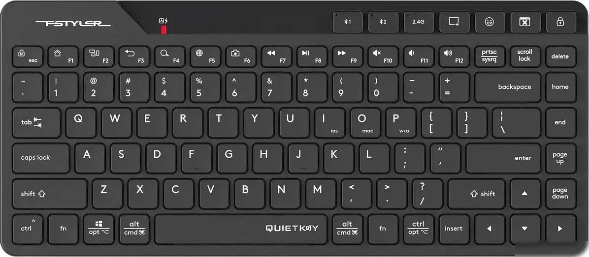 Клавиатура A4Tech Fstyler FBK26C AS — это компактное устройство для работы с компьютерами и Apple. Она работает беспроводно через Bluetooth и радиосигнал, что позволяет подключать её без проводов и свободно перемещаться. Клавиши низкие и удобные для набора текста, а форма клавиш — строчная, что делает печать более комфортной. Нет подсветки и дополнительных функций, таких как цифроблок или дисплей, зато есть возможность переключения между тремя устройствами, что удобно для одновременно использования нескольких гаджетов. Клавиатура легко заряжается через прилагаемый кабель и имеет небольшой вес — всего 340 г, поэтому её легко брать с собой. Радиус действия составляет до 10 метров, а размеры — 138×315×27 мм, что делает устройство компактным и удобным для хранения и переноски.