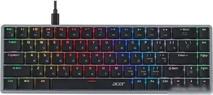 Клавиатура Acer OKW302 — стандартная механическая клавиатура с размером 65%, которая отлично подходит для работы за компьютером. Она имеет классическую высокую форму клавиш и красивую подсветку, что удобно для использования в темноте. В клавиатуре есть USB-A интерфейс и она подключается по проводному подключению с длиной кабеля 1.8 метра. Корпус сделан из пластика, а вес всего около 470 граммов — такую клавиатуру легко переносить и хранить. Она не имеет цифрового блока, а также дополнительных функций вроде подсветки клавиш или блокировки, но благодаря механическим переключателям она обеспечивает удобство и отзывчивость при вводе. Эта клавиатура подойдет для тех, кто ищет простое и надежное устройство для работы или игр.