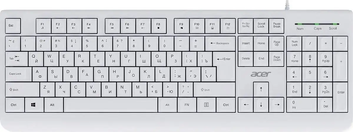 Клавиатура Acer OKW400 — это стандартная полноразмерная клавиатура, предназначенная для работы с ПК. Она выполнена в классическом белом цвете из прочного пластика и имеет высокие клавиши без подсветки. Размеры позволяют комфортно нажимать клавиши благодаря двухэтажной конструкции клавиши Enter. Подключается к компьютеру через USB-A и обладает длинным кабелем длиной 1,8 метра, что обеспечивает удобное расположение. Клавиши оснащены мембранной технологией, которая делает нажатия мягкими и тихими. Она не имеет дополнительных функций, таких как подсветка или медийные кнопки, что упрощает управление и уменьшает лишние расходы. Устройство не оборудовано блоком под запястья или подставкой, но хорошо подходит для офисной работы и ежедневных задач.