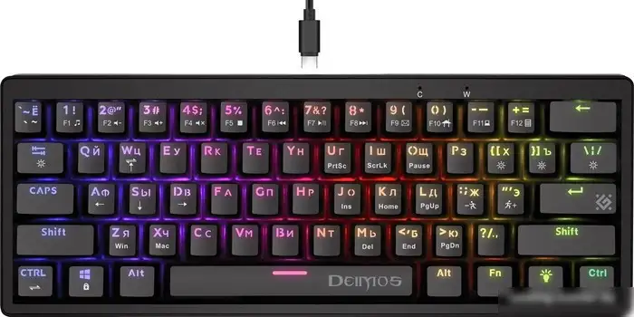 Клавиатура Defender Deimos GK-303 — это компактная механическая клавиатура размером 60%, предназначенная для ПК. Она выполнена в классическом дизайне с высокой клавишей Enter и многоцветной подсветкой, которая не настраивается. Благодаря механическим переключателям TNT Pink с линейным ходом, клавиши откликаются быстро и точно, что важно для игр и работы. Она оснащена заменяемыми переключателями hot-swap, что позволяет легко менять переключатели без пайки, подбирая оптимальные ощущения. Подключение осуществляется через надежный USB-A кабель длиной 1.5 м, а кабель можно отсоединить для удобства хранения. Корпус изготовлен из пластика, вес составляет всего 490 г, что делает клавиатуру легкой и удобной для использования. Этот девайс не имеет встроенной подсветки клавиш, цифрового блока или дополнительных портов, что упрощает его использование.