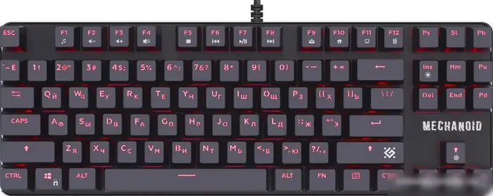 Клавиатура Defender Mechanoid GK-581 — это удобное устройство для игр и работы. Она имеет классическую высокую форму и яркую красную подсветку клавиш, которая помогает одновременно видеть клавиши и сохранять концентрацию. Подключается к ПК через USB кабель длиной 1.5 метра, обеспечивая стабильное соединение. Размеры клавиатуры компактны — 353 мм в ширину и 126 мм в глубину, а вес составляет всего 560 г, что делает её легкой и удобной в использовании. Высокие клавиши и простая форма создают комфорт при длительном наборе текста и играх. Корпус выполнен из прочного пластика, что повышает долговечность устройства. Эта модель не имеет дополнительных функций, таких как подсветка клавиш или возможность подключения к другим устройствам. В ней отсутствует цифровой блок и дополнительные разъёмы, что делает её более компактной. Также она не оснащена подставкой под запястье или пыле- и влагозащитой. Благодаря механическим переключателям клавиши реагируют быстро и точно, что важно для геймеров и активных пользователей.