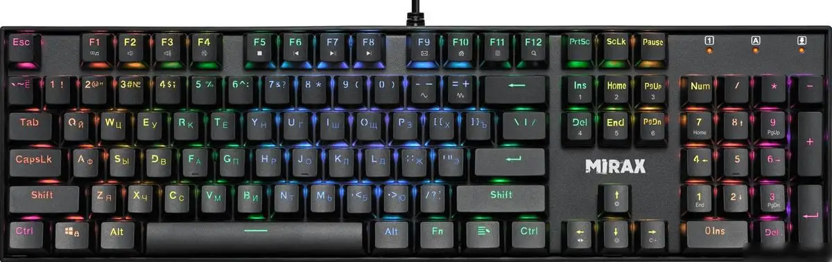 Клавиатура Defender Mirax GK-352 — это полноразмерная игровая модель с механическими переключателями Outemu Blue, которые обеспечивают ощутимый клик и короткий ход. Она подходит для ПК и отличается прочным пластиковым корпусом и классической высотой клавиш. Благодаря подсветке RGB клавиши можно настроить по своему вкусу. Эта клавиатура имеет защиту от пыли и влаги, что позволяет ей дольше оставаться в хорошем состоянии. Она не подключается по беспроводной связи, а интерфейс — USB-A с длиной кабеля 1.8 м. Основные функции делают её удобной для игр и работы, а сменные переключатели позволяют менять их без особых усилий.