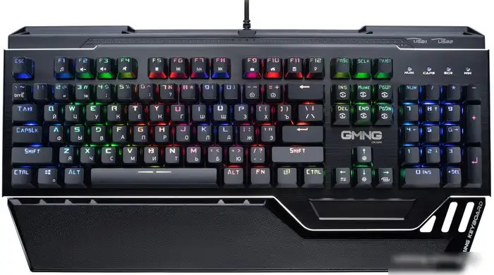 Клавиатура Oklick GMNG 985GK — полноценная игровая клавиатура с механическими переключателями Outemu Red, которые обеспечивают тихую и отзывчивую работу. Она подключается к компьютеру через USB и имеет длину кабеля 1,8 метра, что удобно для расположения в любой зоне игрового стола. Клавиши классической формы обладают подсветкой с множеством цветов, что помогает ориентироваться в темноте. Цифровой блок и металлическая верхняя панель делают устройство более прочным и удобным для работы. Высота клавиши Enter одноэтажная, что облегчает быстрое нажатие. Встроенная съемная подставка под запястье уменьшает усталость при длительной игре. Кроме того, клавиатура имеет USB-порт, что позволяет подключать дополнительные устройства. Она легкая и компактная, весит около 1170 г, что удобно для переноски и использования. Этот модели пригодится для тех, кто ценит качество и комфорт во время игры или работы за компьютером.