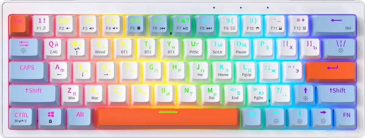 Клавиатура JEGG ZA63 Pro White Blue Orange (TNT Yellow) — это компактное устройство с механическими переключателями TNT Yellow, которое отлично подходит для работы и игр. Она имеет цветную подсветку с 22 режимами и управляется через кабель USB-C или Bluetooth, что удобно для подключения к ПК или другим устройствам. Клавиши расположены в классической форме и оснащены тихими линийными переключателями, обеспечивающими мягкий и тихий набор текста. Благодаря заменяемым переключателям hot-swap, вы можете легко менять их при необходимости. Высокий корпус и прочный пластик делают клавиатуру долговечной и удобной в использовании. Клавиатура работает от встроенного аккумулятора емкостью 1450 мАч, что дает ей возможность работать без постоянного подключения к розетке.