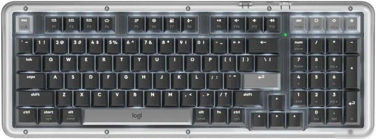 Клавиатура Logitech Alto Keys K98M — это полноценная механическая клавиатура с линейными переключателями Logitech Marble, которая обеспечивает тихую и плавную работу. Она подключается по Bluetooth или радио через USB-приемник Logi Bolt и может переключаться между тремя устройствами, что удобно для работы с несколькими ПК и планшетами. Клавиши выполнены в классической форме с белой подсветкой, которая помогает находить нужные клавиши в темноте. Встроенный аккумулятор емкостью 1500 мАч обеспечивает до 52 недель работы без подзарядки, а зарядка занимает всего 4 часа. Эта клавиатура состоит из прочного пластикового корпуса весом около 1100 г и имеет размеры: длину 401 мм, глубину 147 мм и высоту чуть меньше 40 мм. Она не имеет подсказок или дополнительной подставки под запястья, но поддерживает функцию горячей замены переключателей для личной настройки. Встроенная память позволяет сохранять настройки, а радиус действия составляет до 10 метров, что расширяет возможности использования. Эта модель отлично подходит для тех, кто ищет надежную и комфортную клавиатуру для повседневной работы.